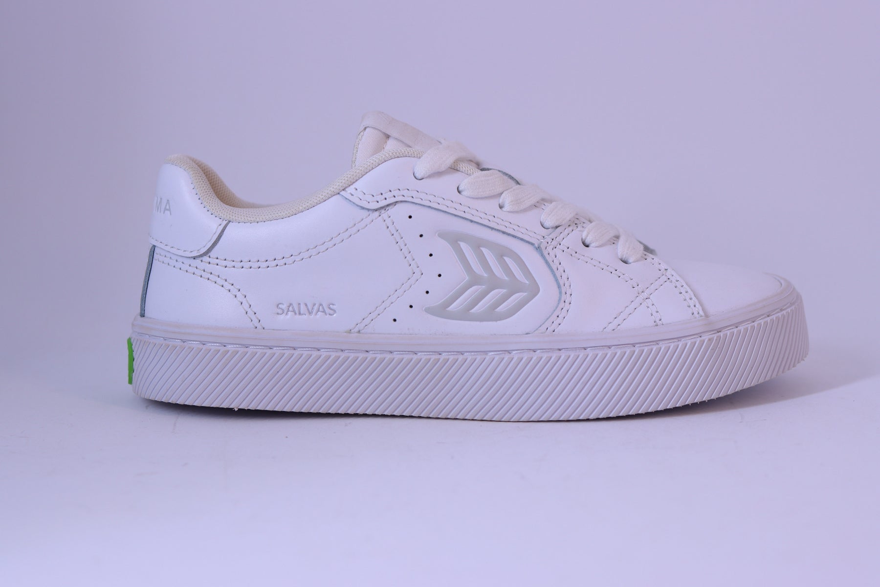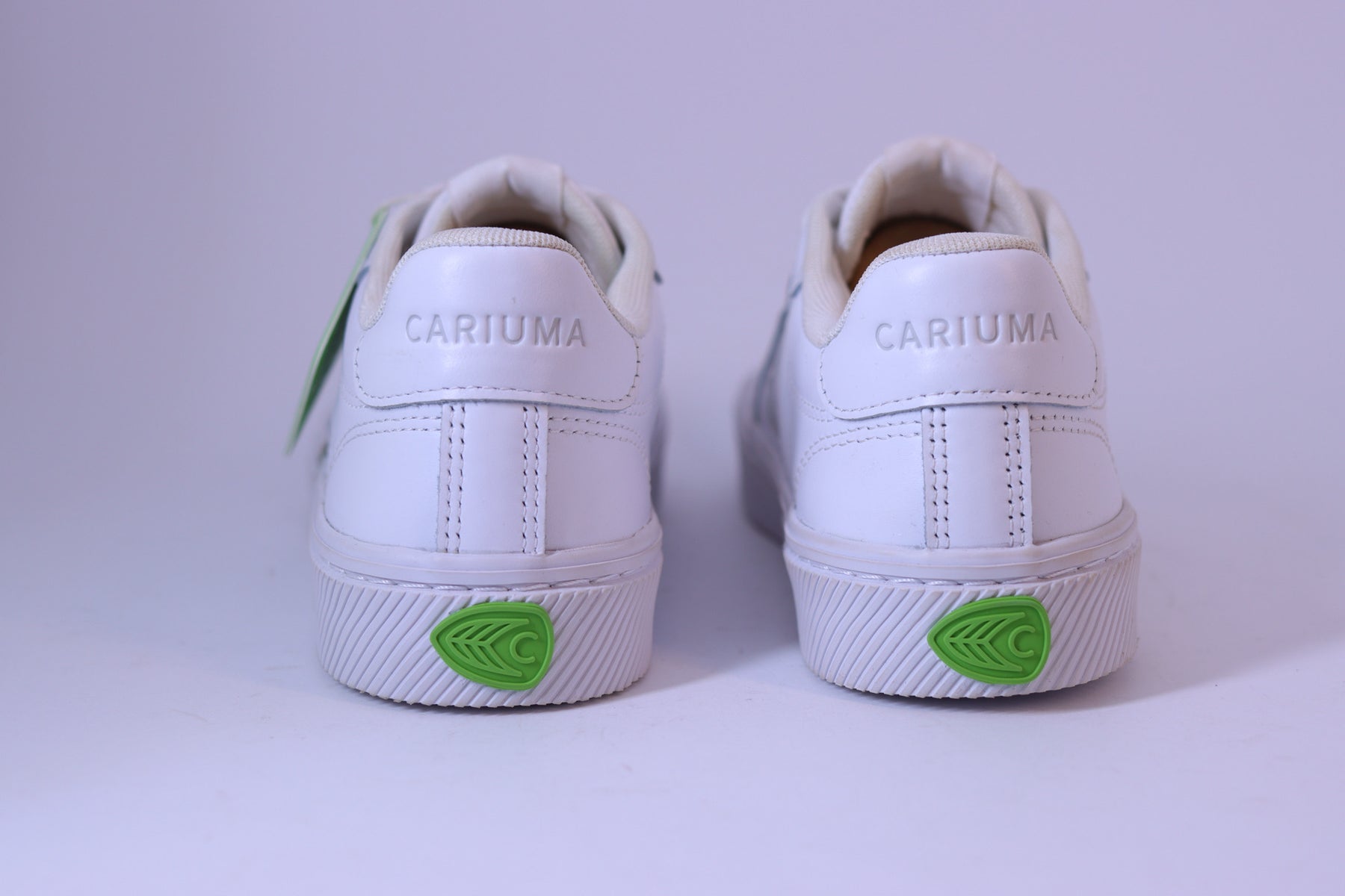 Design clean e sofisticado: cabedal em couro branco com o icônico logo da Cariuma em relevo.